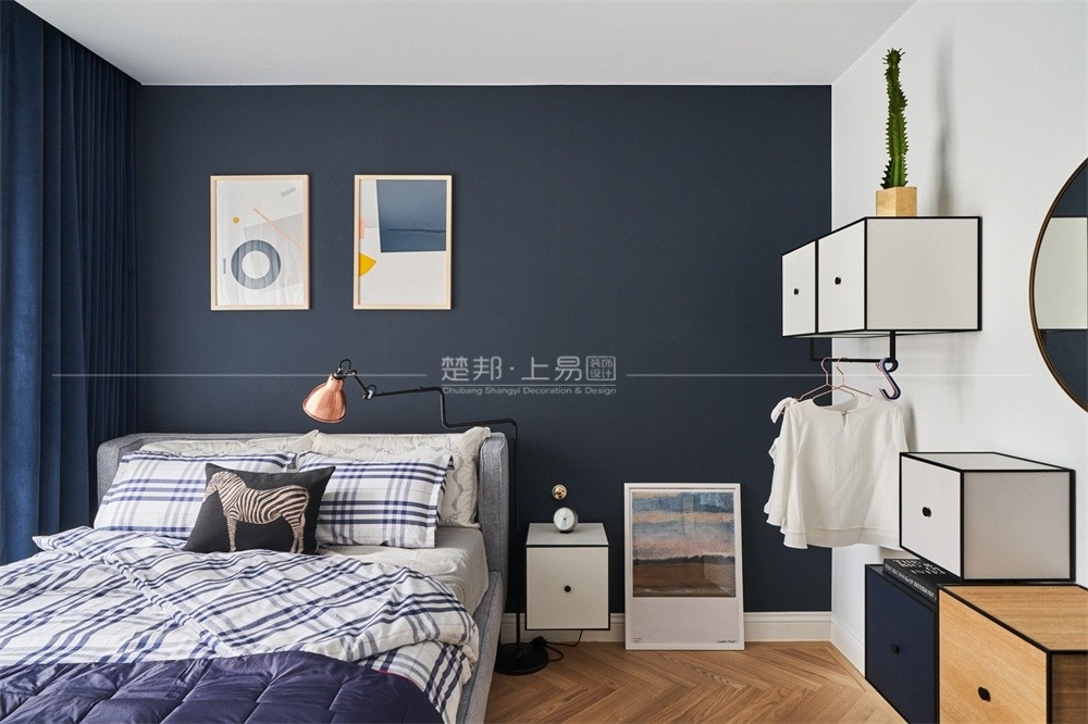 简洁不是时尚的大白墙,深蓝的背景墙与窗帘相互呼应,奇特的床头柜和挂在墙体的储物柜为整体增加了一丝童趣